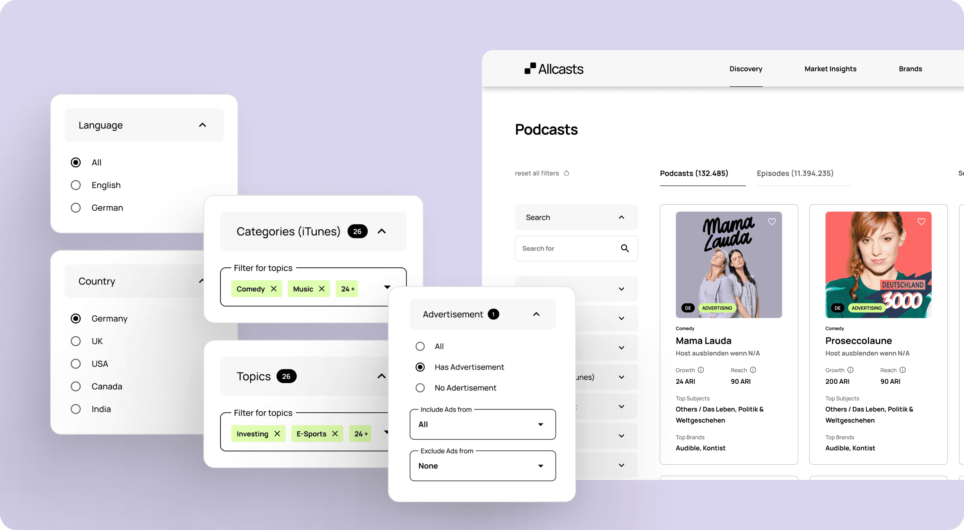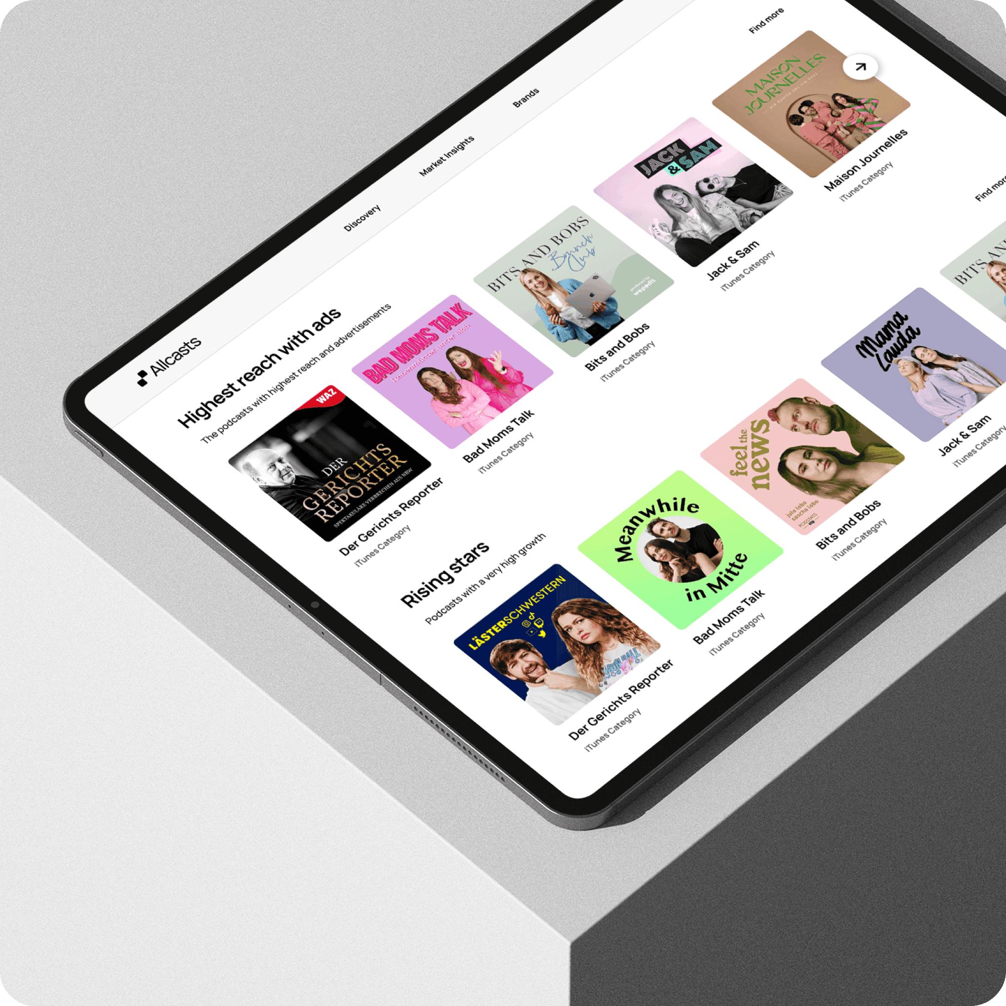 Jeder Podcast, jede Episode des deutschen Marktes wird automatisiert gecheckt – Allcasts findet für Unternehmen Werbemöglichkeiten, Wettbewerbsanalysen und KPIs.