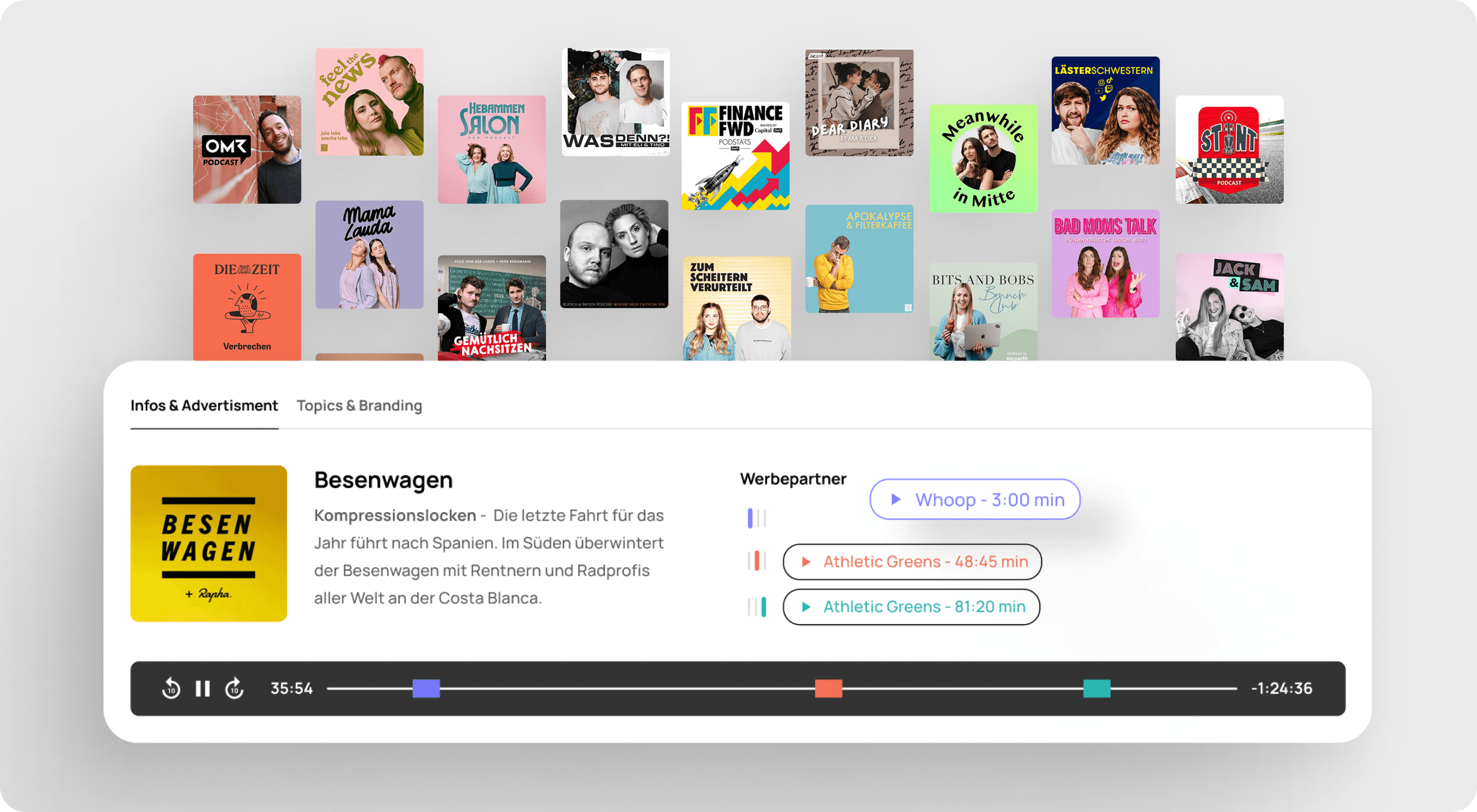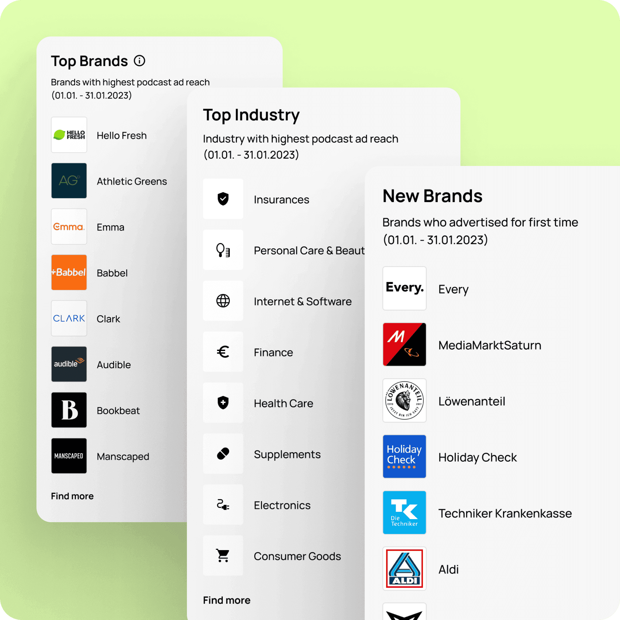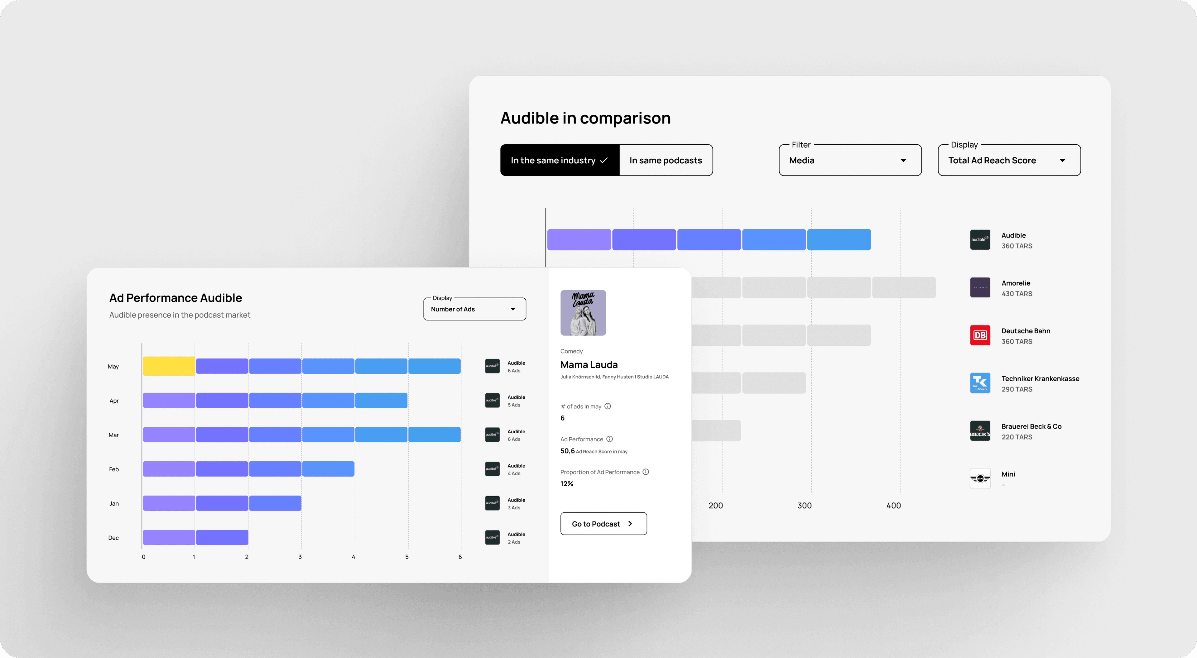 Wir machen 270.000 Podcasts zugänglich mit Analysen auf Werbestellen, besprochene Themen, Reichweite und Engagement. Jeder Werbespot jeder Marke im deutschsprachigen Raum wird automatisiert erkannt und ist im wohl umfangreichsten Archiv der Welt abspielbar.
