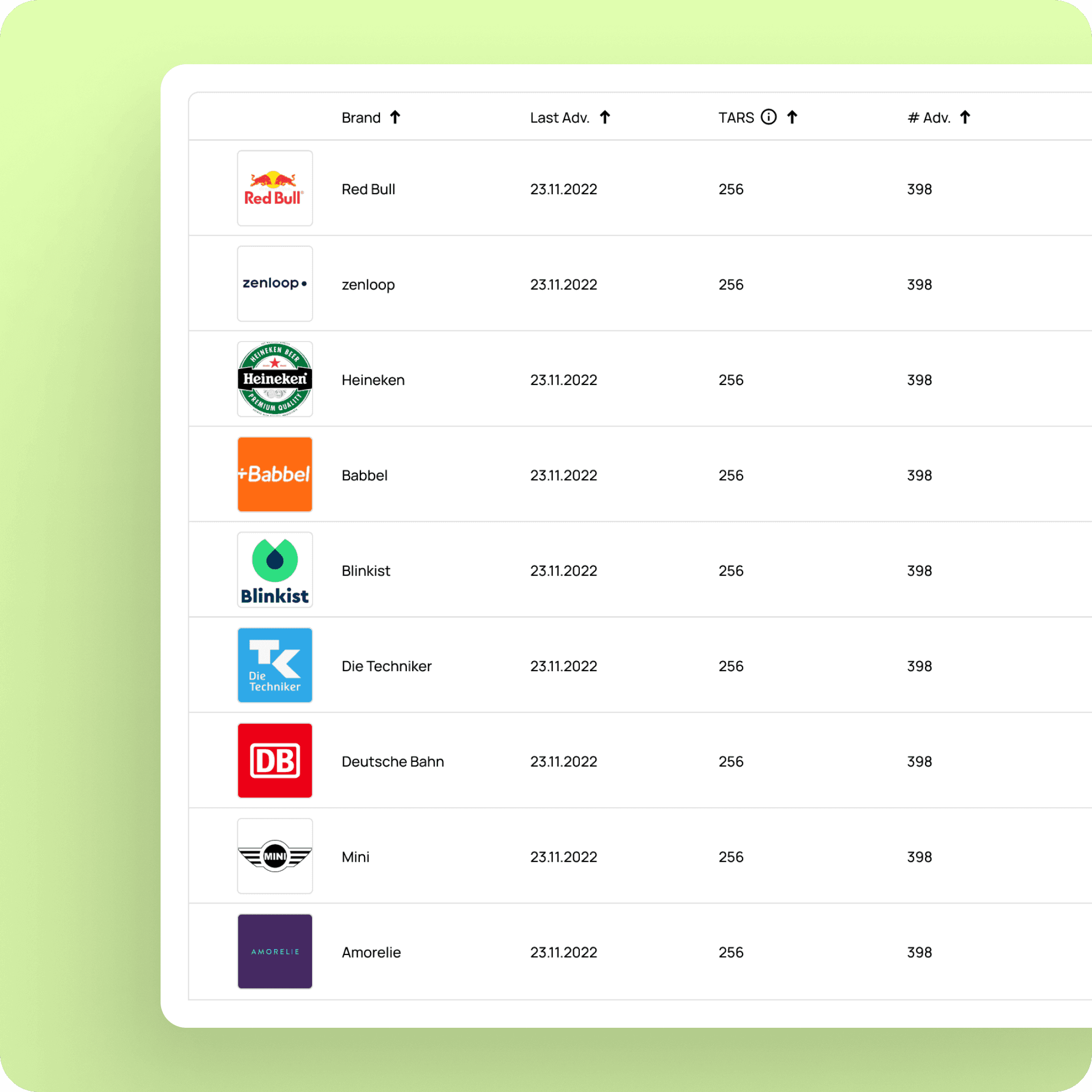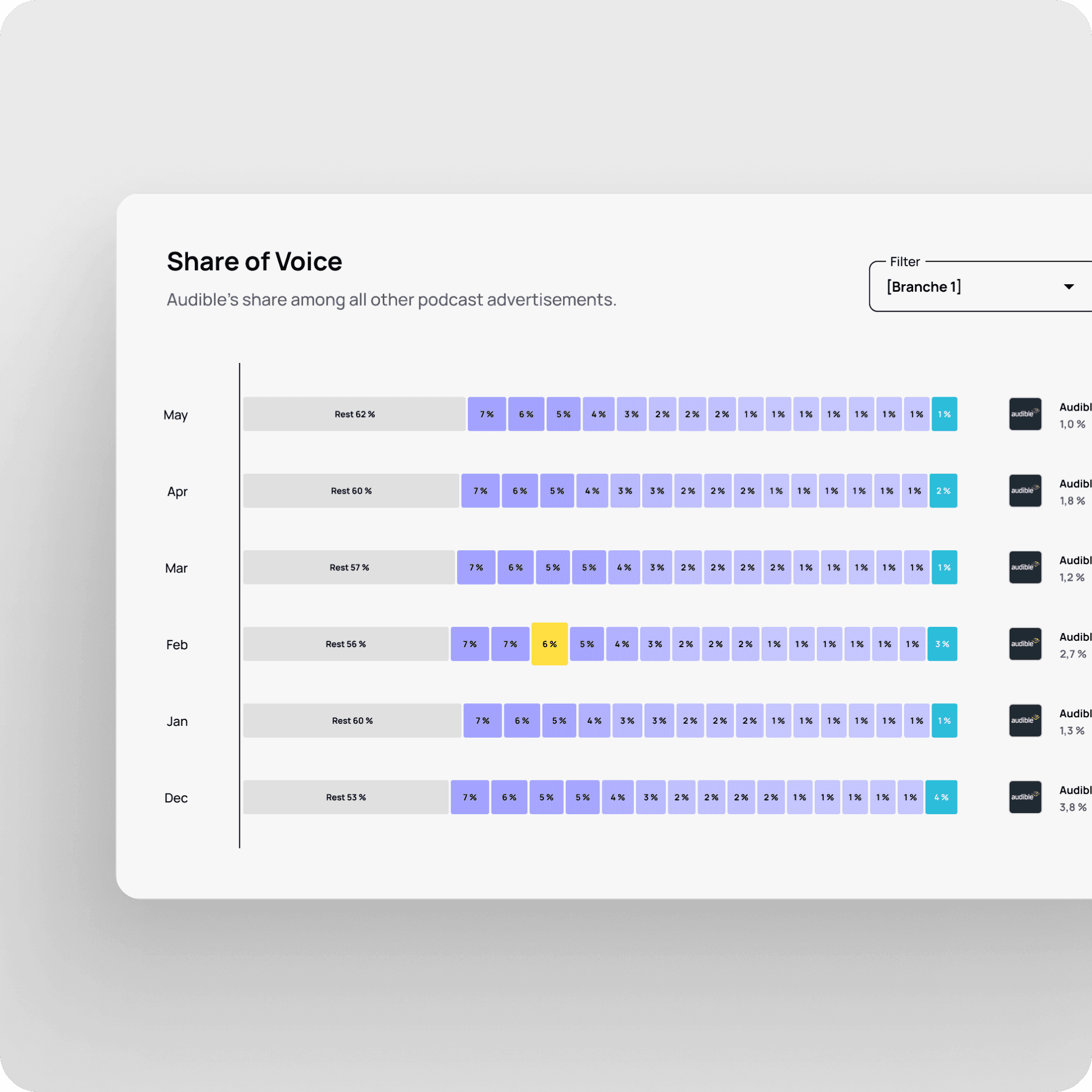 Da Allcasts alle die Reichweite aller Podcasts, sowie die alle Werbetreibenden kennt, stellen wir Exklusiv den Marktanteil jeder werbenden Marke dar: Der Share of Voice.
